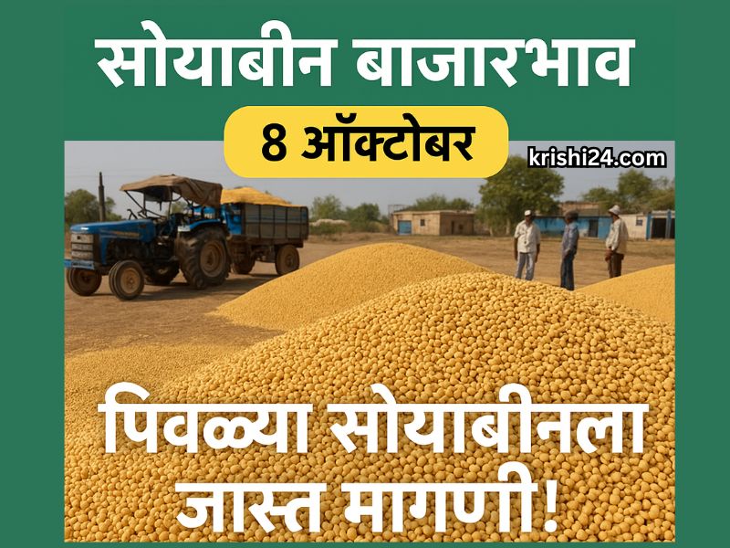 Soyabin bajarbhav : 🌱 सोयाबीन बाजारभाव अपडेट – ८ ऑक्टोबर २०२५ राज्यातील सोयाबीन बाजारात आज तेजीचा सुर दिसून आला असून पिवळ्या सोयाबीनला विशेष मागणी मिळत आहे. एकूण आवक २६,७७५ क्विंटल असून दरात सुधारणा झाली आहे. 📊 महत्त्वाचे आकडे: कमी दर: ₹२,४०० / क्विंटल (बीड) जास्तीत जास्त दर: ₹४,६०० / क्विंटल (उमरखेड) सरासरी दर: ₹३,८६६ / […]