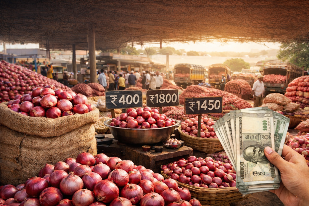 Onion rate : संक्रांतीनंतर कांदा बाजारात आवक वाढली, भावांवर दबाव; शेतकऱ्यांची चिंता कायम..