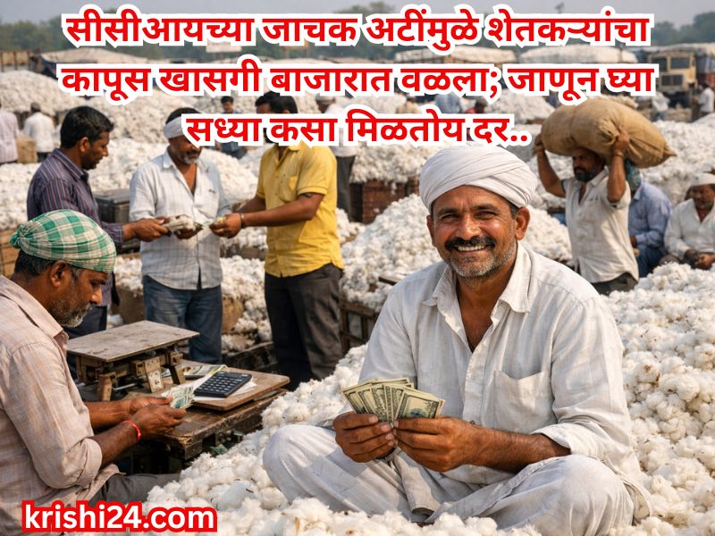 Cotton purchase : सीसीआयच्या जाचक अटींमुळे शेतकऱ्यांचा कापूस खासगी बाजारात वळला; जाणून घ्या सध्या कसा मिळतोय दर…
