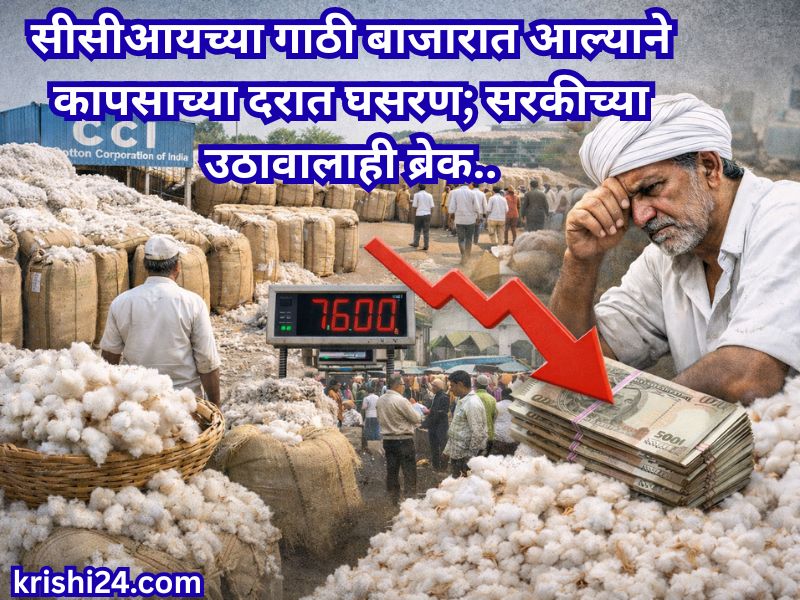 Kapus rate : सीसीआयच्या गाठी बाजारात आल्याने कापसाच्या दरात घसरण; सरकीच्या उठावालाही ब्रेक..