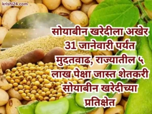 Soybean Procurement Extension : सोयाबीन खरेदीला अखेर 31 जानेवारी पर्यंत मुदतवाढ, राज्यातील ५ लाख पेक्षा जास्त शेतकरी सोयाबीन खरेदीच्या प्रतिक्षेत… January 14, 2025
