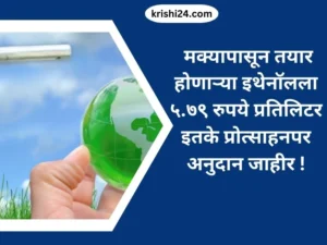 मक्यापासून तयार होणाऱ्या इथेनॉलला ५.७९ रुपये प्रतिलिटर इतके प्रोत्साहनपर अनुदान जाहीर ! January 6, 2024