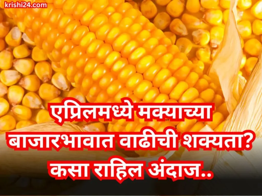 एप्रिल २०२५ मध्ये मक्याच्या बाजारभावात चढ-उतार राहण्याची शक्यता असून, दर वाढण्याची अधिक संधी आहे. महाराष्ट्रातील प्रमुख बाजारपेठांमध्ये एप्रिल महिन्यात मका प्रति क्विंटल २१०० ते २३०० या दरम्यान राहण्याचा अंदाज वर्तविण्यात आला आहे.