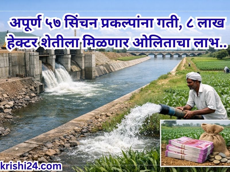 Irrigation projects : राज्यातील अपूर्ण ५७ सिंचन प्रकल्प पूर्ण करण्यासाठी तसेच कालवे आणि पाणी वितरण व्यवस्थेत सुधारणा करण्यासाठी नाबार्डकडून एकूण १५ हजार कोटी रुपयांचे कर्ज घेण्यास राज्य मंत्रिमंडळाने मान्यता दिली आहे. मुख्यमंत्री देवेंद्र फडणवीस यांच्या अध्यक्षतेखाली झालेल्या बैठकीत हा निर्णय घेण्यात आला. या उपक्रमामुळे सुमारे ८ लाख हेक्टर जमीन सिंचनाखाली येऊन शेती उत्पादनवाढीस चालना मिळणार आहे. यापूर्वी ७ ऑगस्ट २०१९ रोजी जलसिंचन प्रकल्पांसाठी वित्तीय संस्थेकडून कर्ज उभारण्याचा निर्णय घेण्यात आला होता.