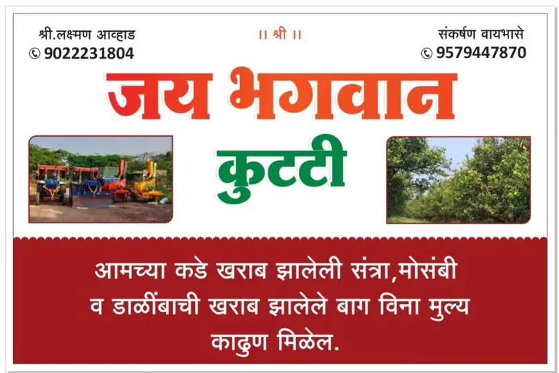 जय भगवान कुट्टी मशीन आमच्या कडे डाळिंब, संत्रा , मोसंबी , द्राक्षे , सिताफळ खराब झालेल्या फळबागा विनामुल्य काढून भेटतील….