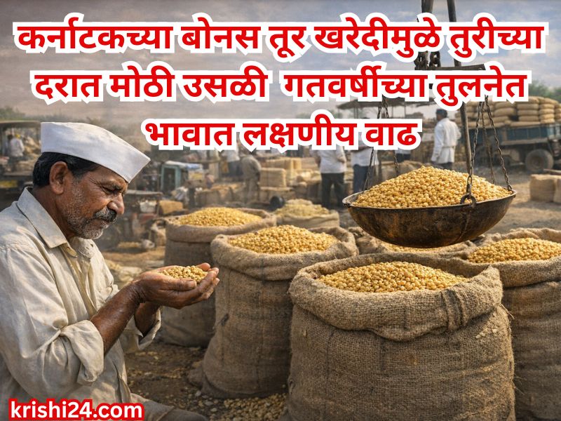 कर्नाटक सरकारने तुरीसाठी जाहीर केलेल्या किमान आधारभूत किमतीपेक्षा (एमएसपी) अधिक दर देत खरेदी केल्यामुळे बाजारात सकारात्मक परिणाम दिसून येत आहे. सध्या तुरीचा एमएसपी दर प्रतिक्विंटल ८ हजार रुपये असताना कर्नाटक सरकारने त्यावर ५०० रुपयांचा बोनस जाहीर करून शेतकऱ्यांचा माल खरेदी केला आहे. या निर्णयामुळे तुरीच्या दरात वाढ होऊन सीमाभागातील जत बाजारपेठेतही तुरीला ८ हजार ते ८ हजार ५०० रुपये प्रतिक्विंटल असा समाधानकारक भाव मिळत आहे, ज्याचा लाभ स्थानिक शेतकऱ्यांनाही होत आहे.