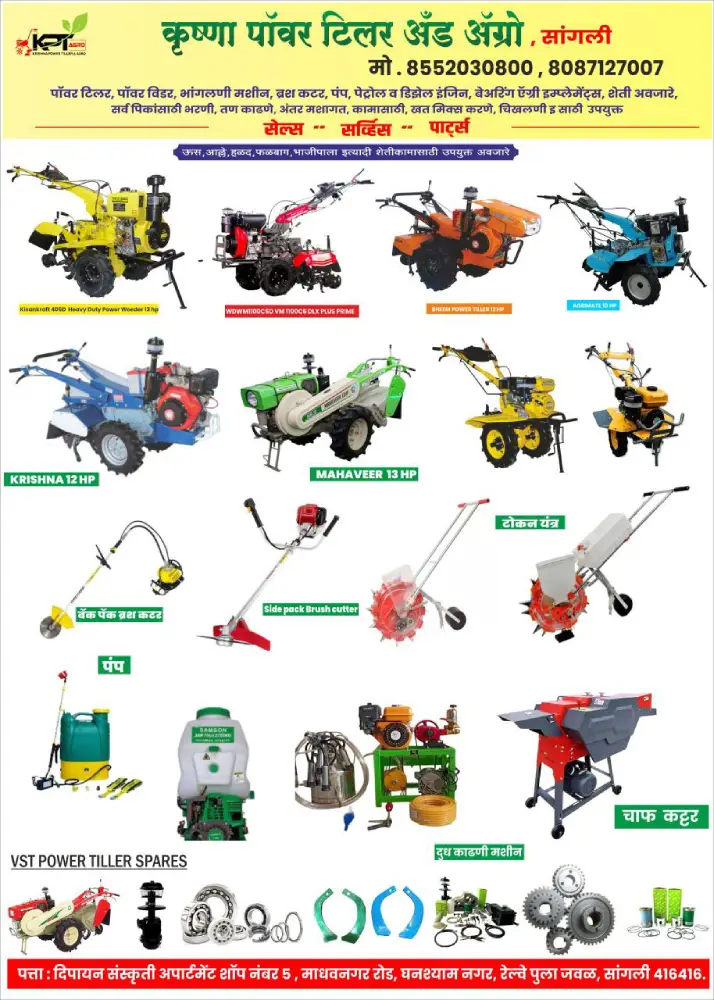 ➡️ पॉवर टिलर, पॉवर विडर, ब्रश कटर, भांगलणी मशीन, डिझेल व पेट्रोल इंजिने, HTP पंप, स्प्रेअर.