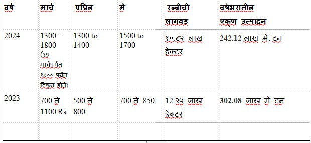 यंदाची रबीची लागवड १७ फेब्रुवारीपर्यंतची आहे ९.९४ लाख हेक्टर इतकी आहे. मागच्या वर्षी एकूण लागवड होती १० लाख ८७ हेक्टर. तर रब्बीचे कांदा उत्पादन ७० टक्के असते आणि खरीपाचे ३० टक्के इतके असते.