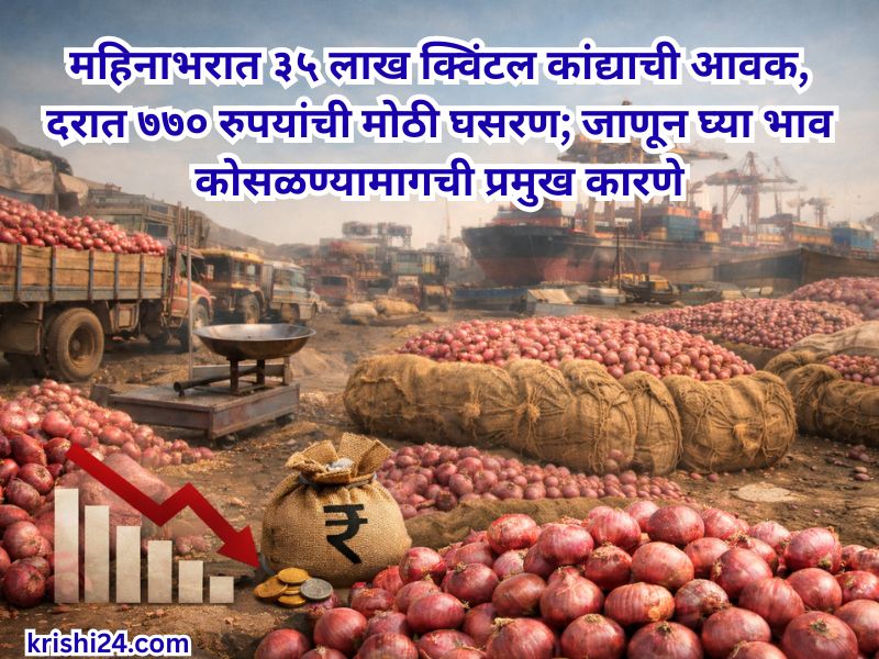 Onion rate : नाशिक जिल्ह्यात जानेवारी महिन्यात लाल कांद्याची मोठ्या प्रमाणावर आवक झाल्याने बाजारभावात लक्षणीय घसरण झाली असून, देशांतर्गत व परदेशी मागणीत घट आणि आखाती देशांकडून कमी होत असलेली खरेदी यांचा यावर परिणाम दिसून येतो. केवळ एका महिन्यात सुमारे ३५ लाख क्विंटल आवक नोंदवली गेली असून, सरासरी दरात सुमारे ७७० रुपयांची घट झाल्याने कांदा उत्पादक शेतकऱ्यांवर आर्थिक ताण वाढला आहे. सध्याच्या दरांत उत्पादन खर्चही निघत नसल्याने नुकसानभरपाई म्हणून विक्री होणाऱ्या प्रत्येक क्विंटलमागे किमान एक हजार रुपयांचे अनुदान देण्याची मागणी होत असून, शासनाने तातडीने हस्तक्षेप करून दिलासा द्यावा अशी अपेक्षा व्यक्त केली जात आहे.