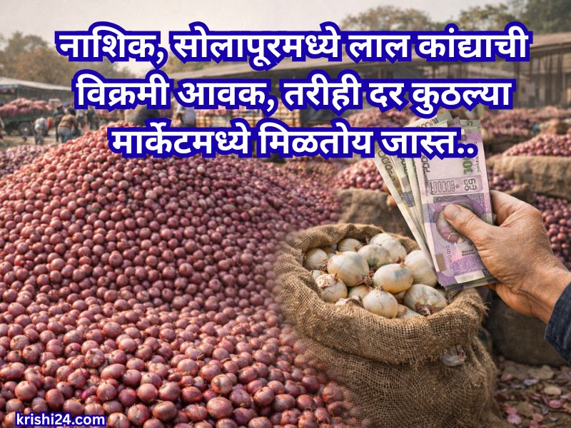 Onion rate : कांदा बाजारात अद्याप अपेक्षित सुधारणा झालेली दिसत नसून, २० जानेवारी रोजी सुमारे २ लाख क्विंटलहून अधिक कांद्याची आवक नोंदवली गेली. यामध्ये नाशिक जिल्ह्यात लाल कांदा ७६ हजार क्विंटल तर पोळ कांदा २० हजार क्विंटल इतकी मोठी आवक झाली. दरांच्या बाबतीत बाजारांनुसार तफावत दिसून आली असून, लासलगाव-निफाड येथे लाल कांद्याला किमान ८०० तर सरासरी १५०० रुपये, सोलापूर बाजारात किमान १०० तर सरासरी ११०० रुपये दर मिळाला. नागपूर, कळवण, भुसावळ, नांदगाव, पुणे, जुन्नर-आळेफाटा आणि पिंपळगाव बसवंत अशा विविध बाजारांमध्ये कांद्याच्या प्रकारानुसार ९५० ते २१०० रुपयांपर्यंत सरासरी दर नोंदवले गेले, ज्यावरून बाजारातील अनिश्चितता आणि आवकेचा दबाव स्पष्टपणे जाणवतो..