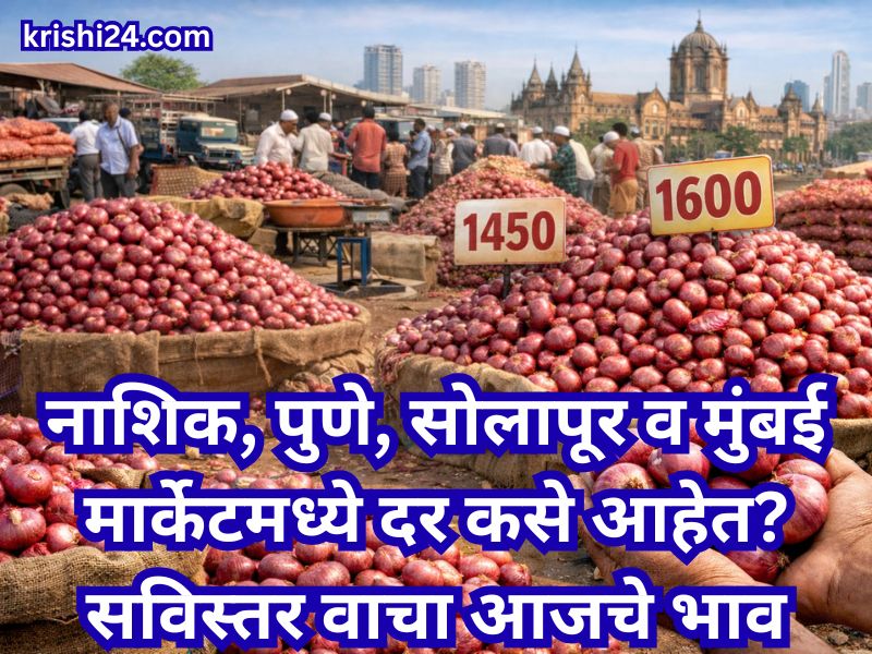 Onion rate : आज २३ जानेवारी रोजी राज्यातील बाजार समित्यांमध्ये कांद्याची एकूण १ लाख ८७ हजार क्विंटल आवक नोंदली गेली असून यामध्ये नाशिक जिल्ह्यात लाल कांद्याची सुमारे ९६ हजार क्विंटल आणि पोळ कांद्याची २२ हजार क्विंटल आवक झाली. लासलगाव बाजारात लाल कांद्याला किमान ६०० रुपये तर सरासरी १,४५० रुपये दर मिळाला, तर येवला १,३००, अमरावती १,६००, कळवण व देवळा १,४५०, राहता १,५५० रुपये दर नोंदवले गेले. पुणे मार्केटमध्ये लोकल कांद्याला किमान ५०० आणि सरासरी १,१५० रुपये, इस्लामपूरमध्ये १,७५०, मंगळवेढ्यात १,५००, पिंपळगाव बसवंतमध्ये पोळ कांद्याला १,३७५ रुपये तर मुंबई कांदा बटाटा मार्केटमध्ये सर्वसाधारण कांद्याला सरासरी १,५०० रुपये दर मिळाला, त्यामुळे बाजारात भाव स्थिर ते किंचित मजबूत असल्याचे चित्र दिसून येत आहे.
